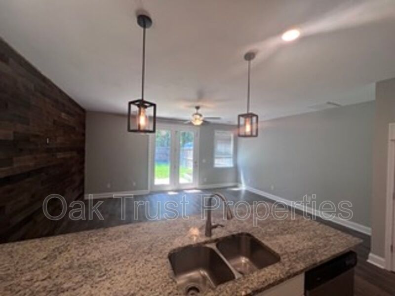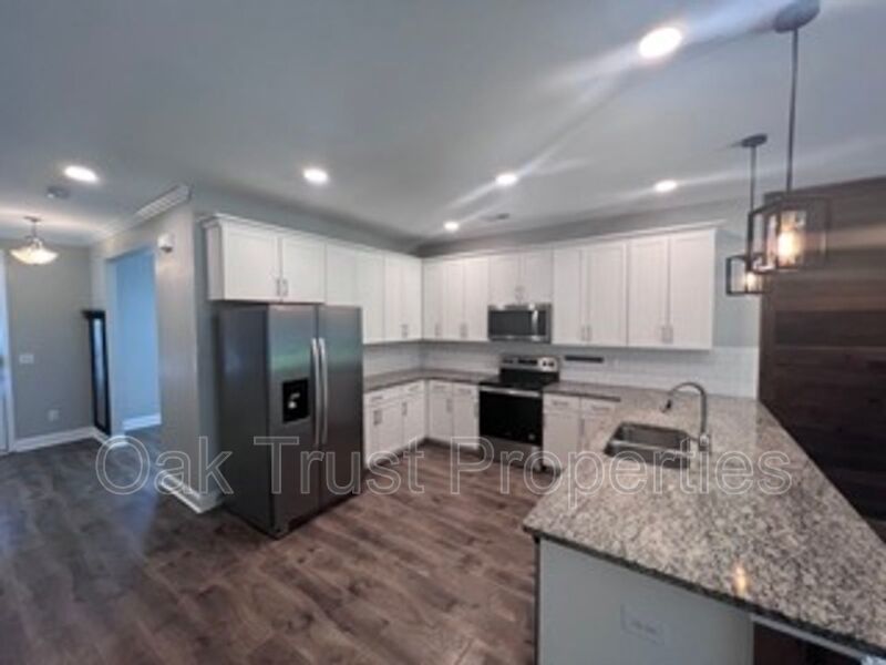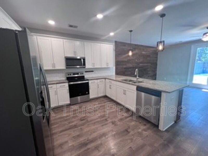 Welcome to this beautifully updated townhome offering 3 bedrooms and 2.5 bathrooms in a convenient location. This move-in ready home blends modern finishes with comfortable living spaces. Step inside to find an open-concept layout with luxury vinyl plank flooring throughout the main level. The spacious kitchen features granite countertops, stainless steel appliances, crisp white cabinetry, and ample storage. The kitchen flows seamlessly into the living area, highlighted by a custom accent wall, pendant lighting, and direct access to the private fenced backyard. Upstairs, the primary suite boasts a large closet and en-suite bath with dual vanities and a walk-in shower. Additional bedrooms provide flexibility for family, guests, or a home office. The bathrooms are modern and well-appointed, offering both tub and shower options. Outside, enjoy your private fenced yard with patio space, perfect for entertaining or relaxing. The home also includes a storage building for added convenience.