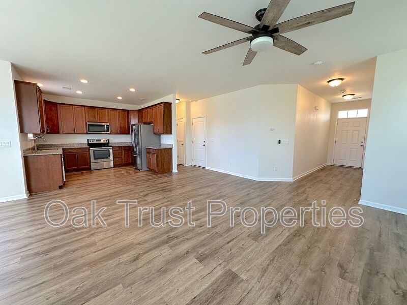 Discover this charming 3-bedroom, 2.5-bathroom two-story home in Cane Bay! The main level features elegant luxury vinyl plank flooring and an open floor plan, highlighted by a stunning kitchen with granite countertops, stainless steel appliances, and plenty of cabinet and counter space. Upstairs, you'll find all three bedrooms with ceiling fans, a versatile loft area, and a private primary bathroom. Enjoy the fully fenced backyard and the convenience of a 2-car garage. Washer and dryer hookups are included, and lawn care is provided. This home is a true gem—schedule a visit today!